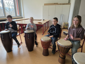 Seit kurzem gibt es an der Grundschule ein neues Instrument: die Klangblüte, eine liebevoll bemalte Meditationstrommel mit warmem, klaren Tönen. Sie begleitet die Kinder bei kleinen Entspannungspausen – und inzwischen auch unsere Schafe.